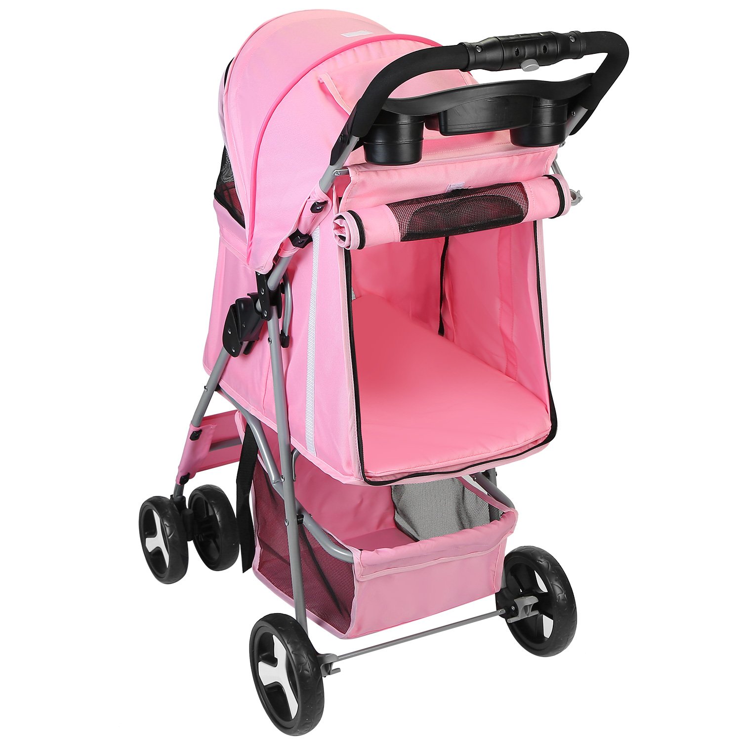 4 Wheels Pet Stroller Foldable Carrier Strolling Cart Travel Jogger Pet Stroller with Removable Liner Storage Basket for Dog Cat