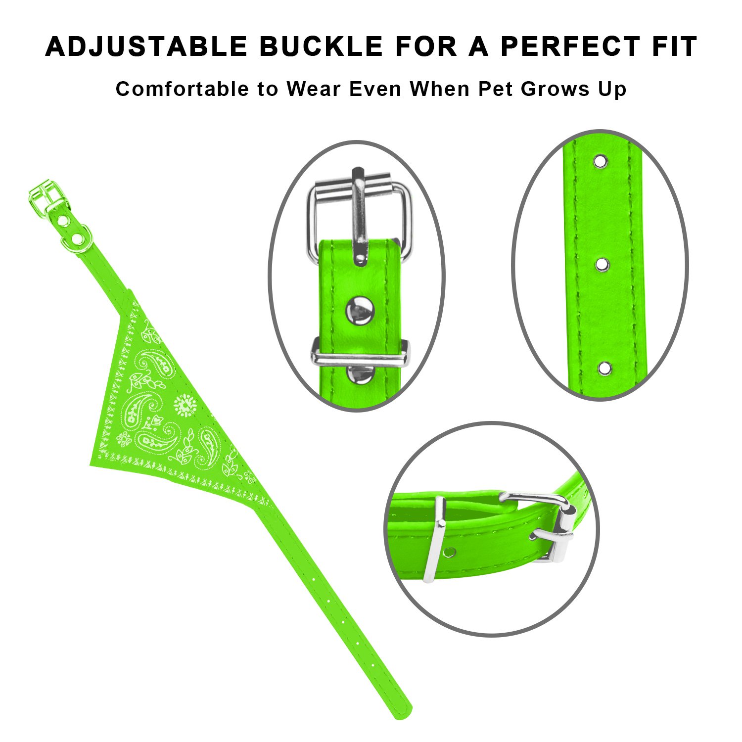 Combing a high quality leather collar with colorful bandana scarf, this pet collar eliminates the need to buy a collar and scarf apart or make a collar/scarf on your own, saving bills and time once for all. Adjustable leather belt ensures a comfortable fit even when your pet grows up with no need to change collars frequently. Bandana scarf adds up to your pet’s looks while the breathable canvas fabric allows your pet stay cool even in hot summer days. It’s not only great for dressing your pet up but also makes for a great gift to your friends.