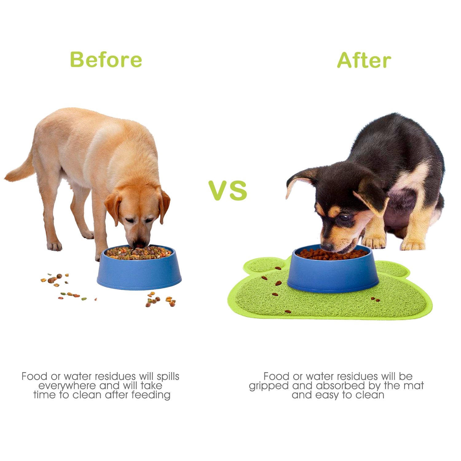 Our pet feeding mat adopts food-grade dense ring-shaped PVC fiber materials, non-toxic, soft, sturdy, durable, abrasion resistance and meantime, can grip the litters tightly to avoid any mess. Overspreading floor-friendly textures and suctions on its back, it is non-slip. It has multiple functions to be used as placemat, litter catcher mat, indoor or outdoor welcome mat, etc.