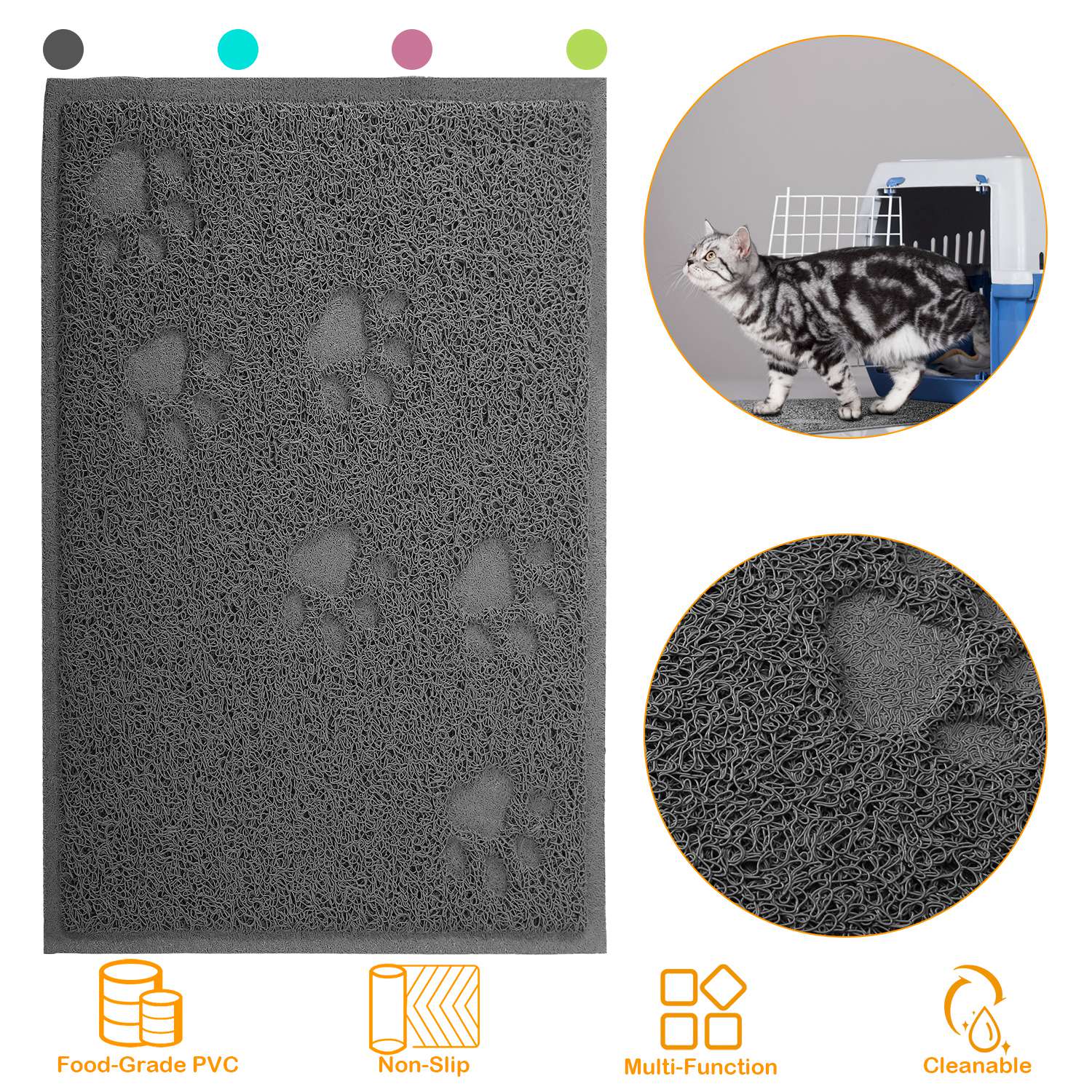 Our pet feeding mat adopts food-grade dense ring-shaped PVC fiber materials, non-toxic, soft, sturdy, durable, abrasion resistance and meantime, can grip the litters tightly to avoid any mess. Overspreading floor-friendly textures and suctions on its back, it is non-slip. It has multiple functions to be used as placemat, litter catcher mat, indoor or outdoor welcome mat, etc.